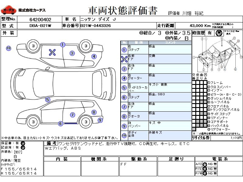| メーカー・車種 | 日産 デイズ J (型式:DBA-B21W) | ||||||||||||||||||||||||||||||||||||||||