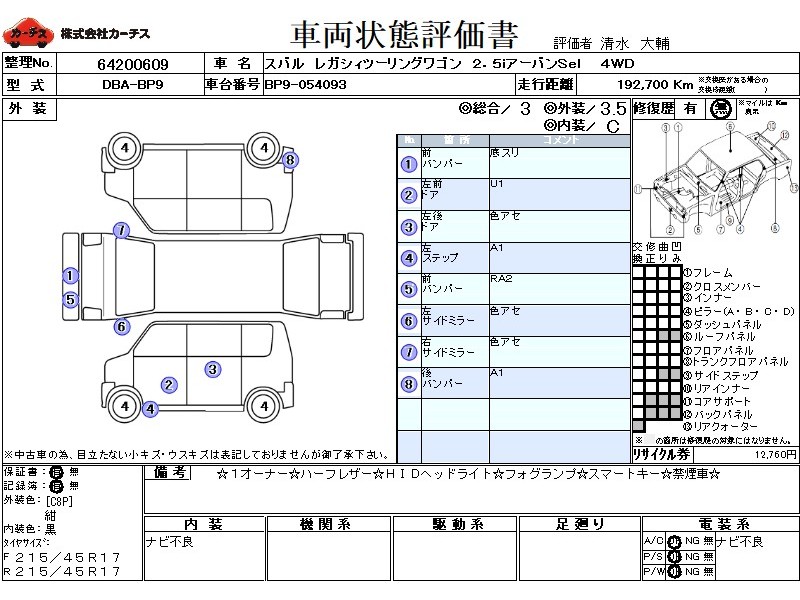 | メーカー・車種 | スバル レガシィツーリングワゴン 2.5iアーバンSel (型式:DBA-BP9) | ||||||||||||||||||||||||||||||||||||||||