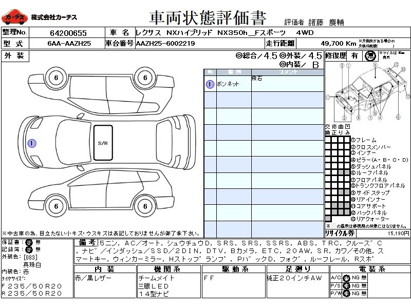 | メーカー・車種 | レクサス NXハイブリッド NX350h_Fスポーツ (型式:6AA-AAZH25) | ||||||||||||||||||||||||||||||||||||||||