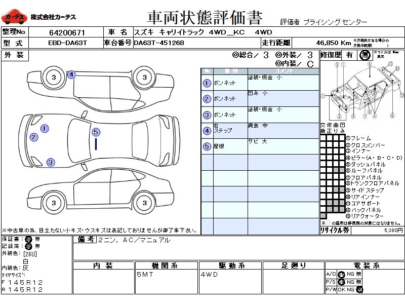 | メーカー・車種 | スズキ キャリイトラック 4WD_KC (型式:EBD-DA63T) | ||||||||||||||||||||||||||||||||||||||||