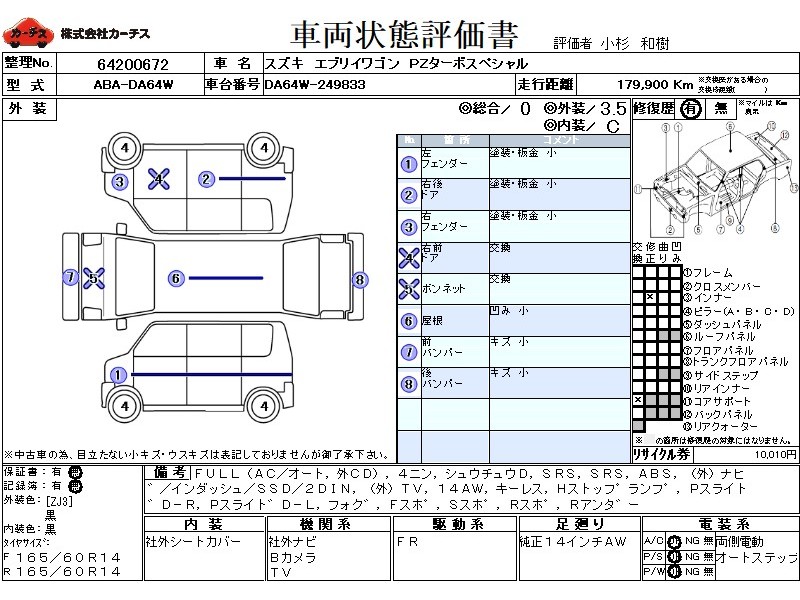 | メーカー・車種 | スズキ エブリイワゴン PZターボスペシャル (型式:ABA-DA64W) | ||||||||||||||||||||||||||||||||||||||||