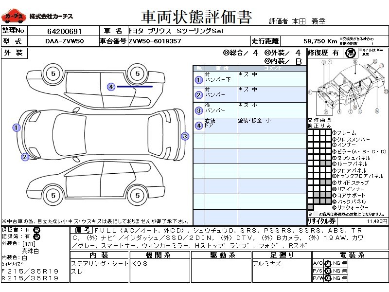 | メーカー・車種 | トヨタ プリウス SツーリングSel (型式:DAA-ZVW50) | ||||||||||||||||||||||||||||||||||||||||