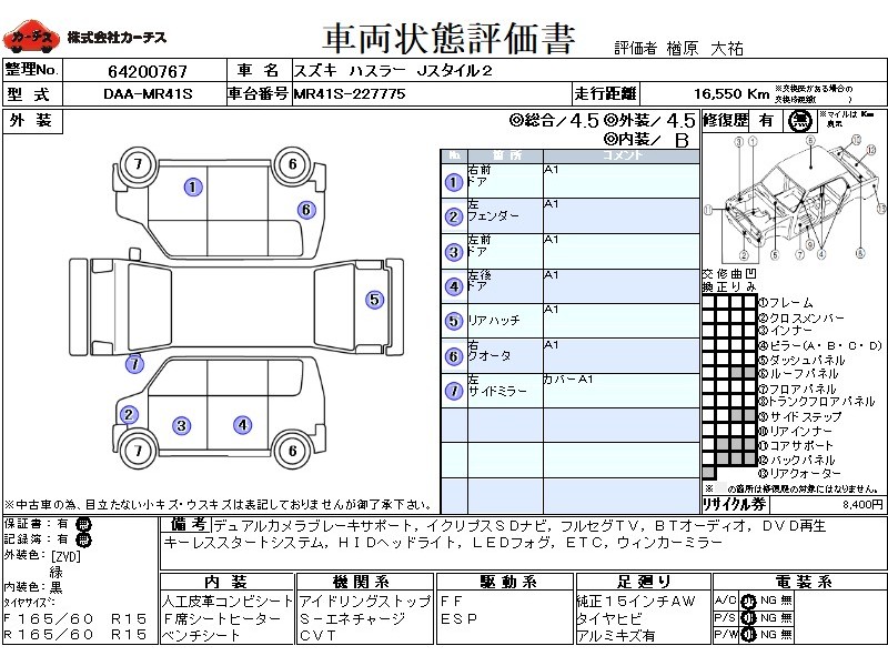 | メーカー・車種 | スズキ ハスラー Jスタイル2 (型式:DAA-MR41S) | ||||||||||||||||||||||||||||||||||||||||