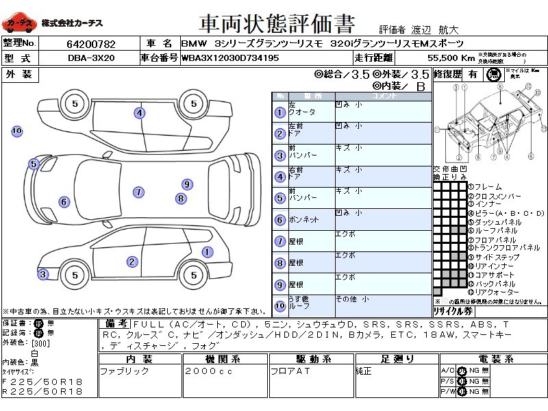 | メーカー・車種 | BMW 3シリーズグランツーリスモ 320iグランツーリスモMスポーツ (型式:DBA-3X20) | ||||||||||||||||||||||||||||||||||||||||