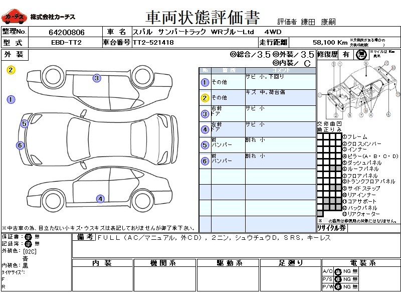 | メーカー・車種 | スバル サンバートラック WRブルーLtd (型式:EBD-TT2) | ||||||||||||||||||||||||||||||||||||||||