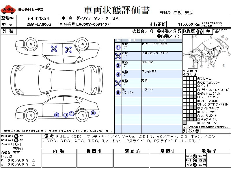| メーカー・車種 | ダイハツ タント X_SA (型式:DBA-LA600S) | ||||||||||||||||||||||||||||||||||||||||