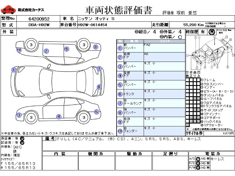 | メーカー・車種 | 日産 オッティ S (型式:DBA-H92W) | ||||||||||||||||||||||||||||||||||||||||