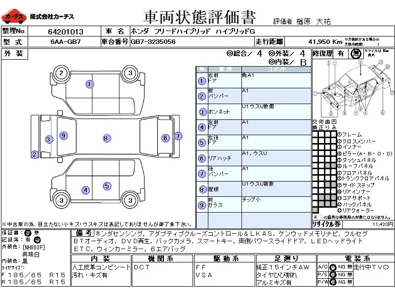 | メーカー・車種 | ホンダ フリードハイブリッド ハイブリッドG (型式:6AA-GB7) | ||||||||||||||||||||||||||||||||||||||||