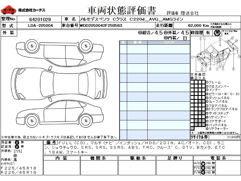 | メーカー・車種 | メルセデスベンツ Cクラス C220d_AVG_AMGライン (型式:LDA-205004) | ||||||||||||||||||||||||||||||||||||||||