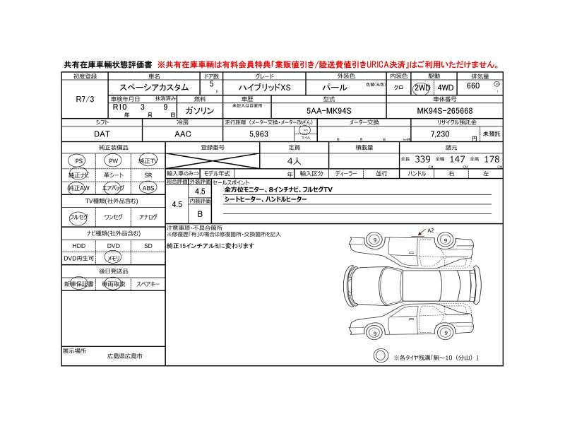 | メーカー・車種 | スズキ スペーシアカスタム ハイブリッドXS (型式:5AA-MK94S) | ||||||||||||||||||||||||||||||||||||||||