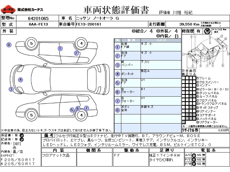 | メーカー・車種 | 日産 ノートオーラ G (型式:6AA-FE13) | ||||||||||||||||||||||||||||||||||||||||
