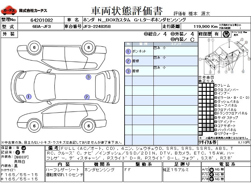 | メーカー・車種 | ホンダ N BOXカスタム G・Lターボホンダセンシング (型式:6BA-JF3) | ||||||||||||||||||||||||||||||||||||||||