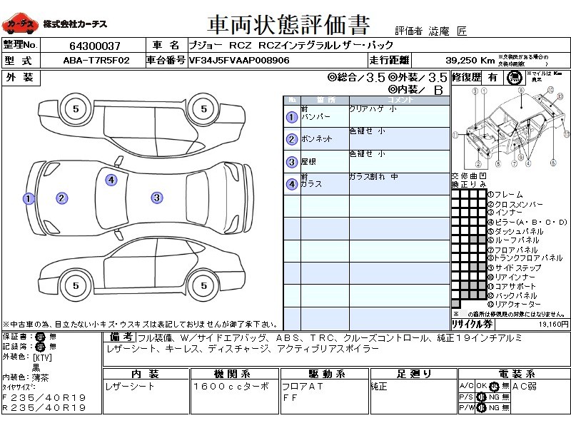 | メーカー・車種 | プジョー RCZ RCZインテグラルレザー・パック (型式:ABA-T7R5F02) | ||||||||||||||||||||||||||||||||||||||||