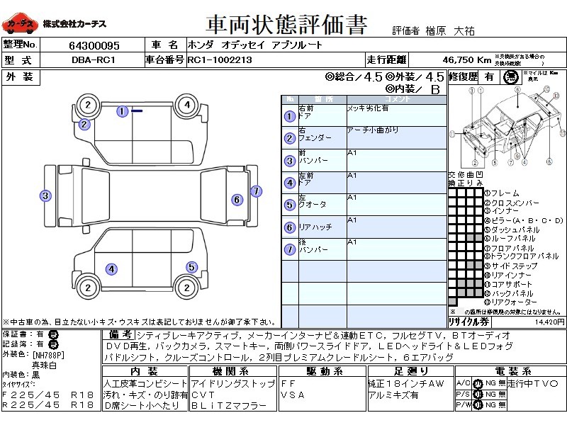 | メーカー・車種 | ホンダ オデッセイ アブソルート (型式:DBA-RC1) | ||||||||||||||||||||||||||||||||||||||||