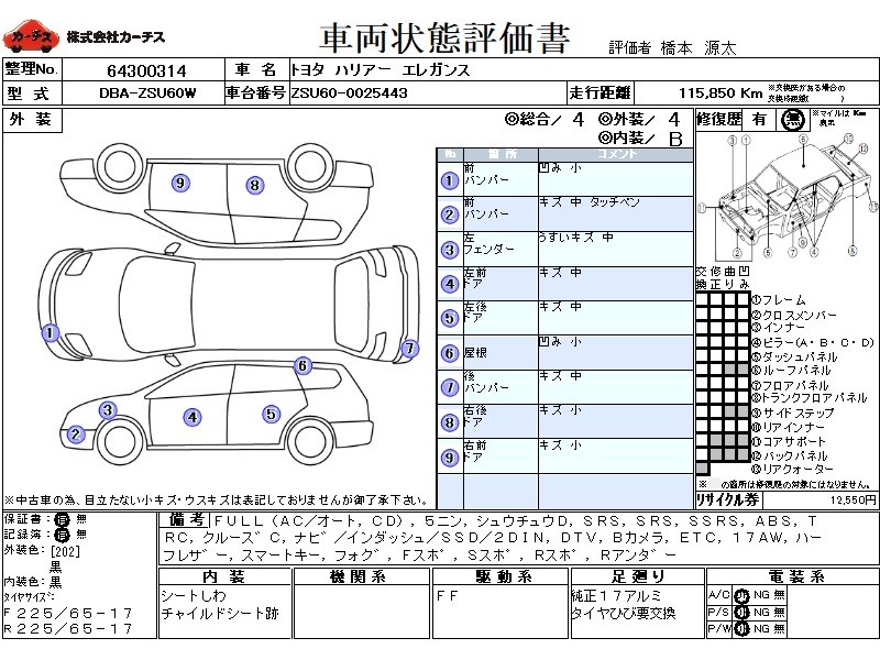 | メーカー・車種 | トヨタ ハリアー エレガンス (型式:DBA-ZSU60W) | ||||||||||||||||||||||||||||||||||||||||