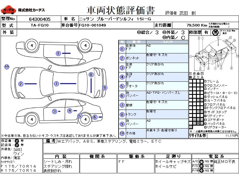 | メーカー・車種 | 日産 ブルーバードシルフィ 15i-G (型式:TA-FG10) | ||||||||||||||||||||||||||||||||||||||||
