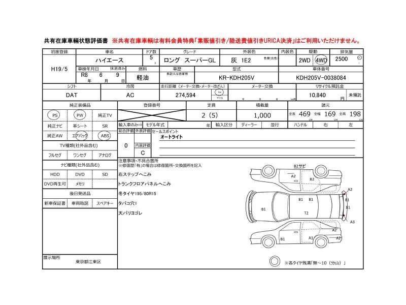 | メーカー・車種 | トヨタ ハイエースバン ロングスーパーGL (型式:KR-KDH205V) | ||||||||||||||||||||||||||||||||||||||||