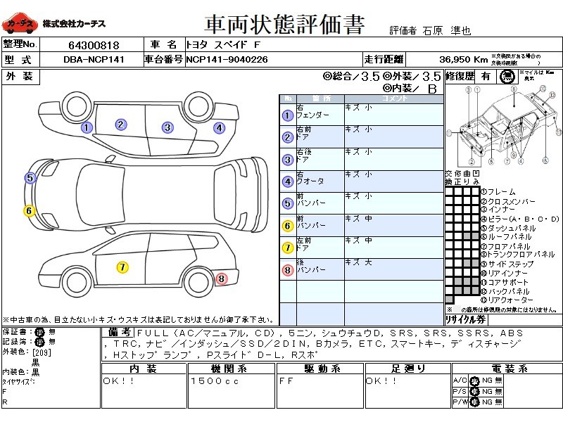 | メーカー・車種 | トヨタ スペイド F (型式:DBA-NCP141) | ||||||||||||||||||||||||||||||||||||||||