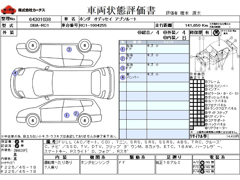 | メーカー・車種 | ホンダ オデッセイ アブソルート (型式:DBA-RC1) | ||||||||||||||||||||||||||||||||||||||||