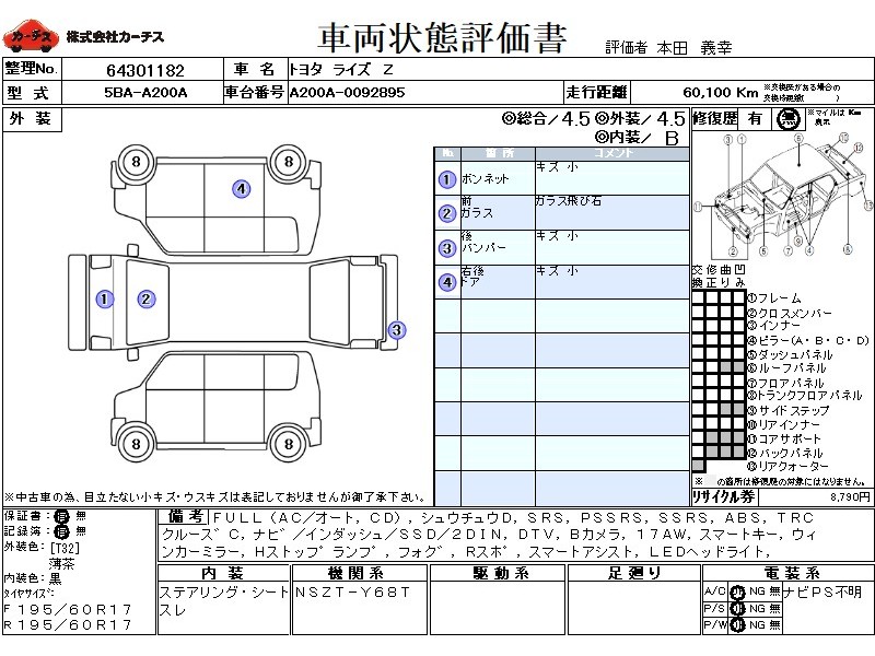 | メーカー・車種 | トヨタ ライズ Z (型式:5BA-A200A) | ||||||||||||||||||||||||||||||||||||||||