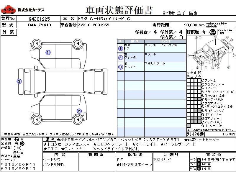 | メーカー・車種 | トヨタ C-HRハイブリッド G (型式:DAA-ZYX10) | ||||||||||||||||||||||||||||||||||||||||