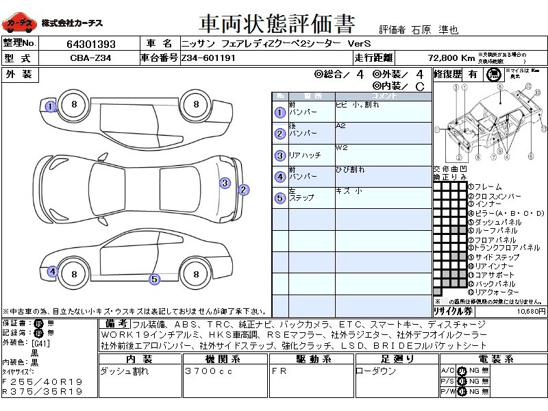 | メーカー・車種 | 日産 フェアレディZクーペ2シーター VerS (型式:CBA-Z34) | ||||||||||||||||||||||||||||||||||||||||