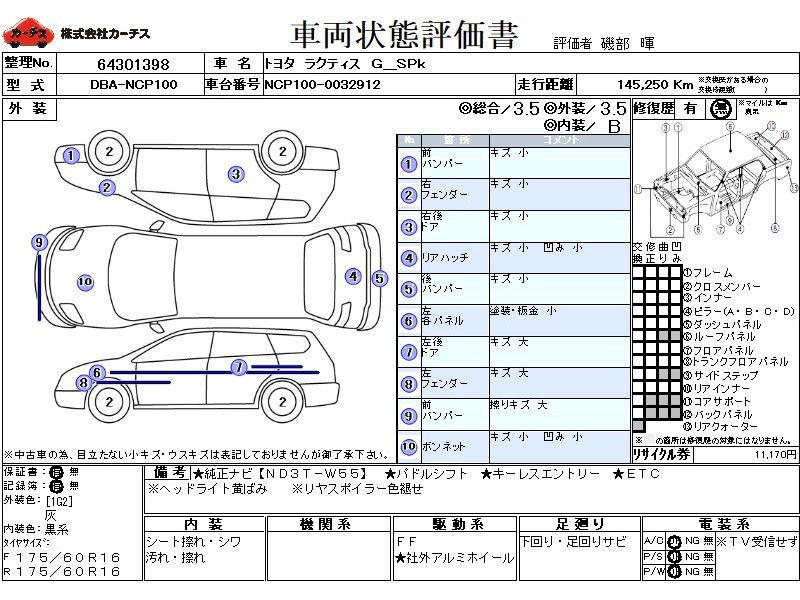 | メーカー・車種 | トヨタ ラクティス G_SPk (型式:DBA-NCP100) | ||||||||||||||||||||||||||||||||||||||||