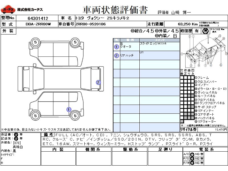 | メーカー・車種 | トヨタ ヴォクシー ZSキラメキ2 (型式:DBA-ZRR80W) | ||||||||||||||||||||||||||||||||||||||||
