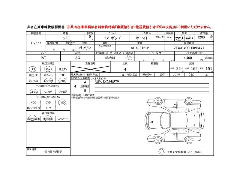| メーカー・車種 | フィアット 500 1.2ポップ (型式:ABA-31212) | ||||||||||||||||||||||||||||||||||||||||