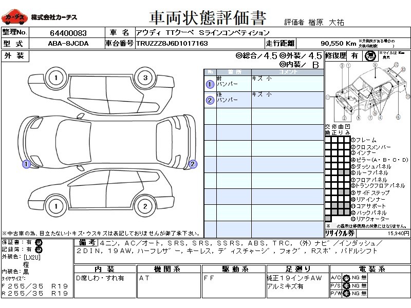 | メーカー・車種 | アウディ TTクーペ Sラインコンペティション (型式:ABA-8JCDA) | ||||||||||||||||||||||||||||||||||||||||