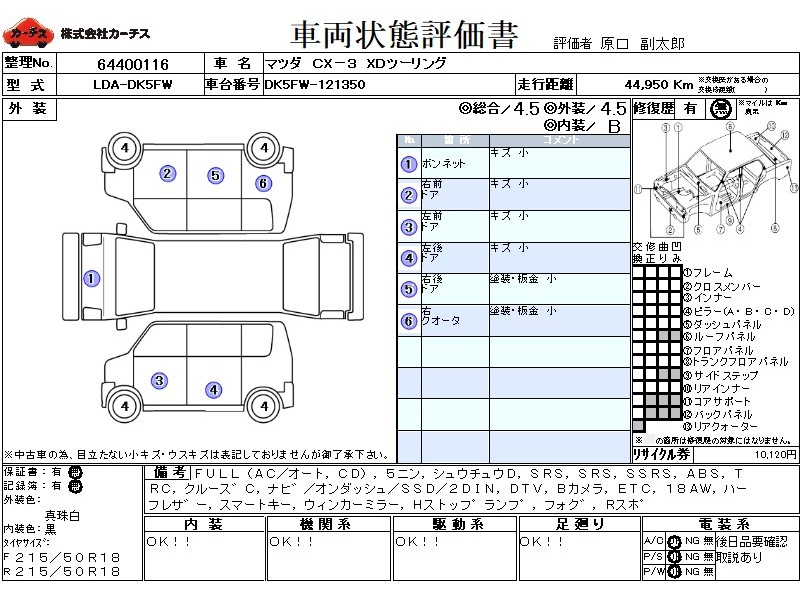| メーカー・車種 | マツダ CX-3 XDツーリング (型式:LDA-DK5FW) | ||||||||||||||||||||||||||||||||||||||||