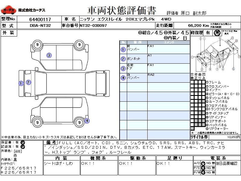 | メーカー・車種 | 日産 エクストレイル 20XエマブレPk (型式:DBA-NT32) | ||||||||||||||||||||||||||||||||||||||||