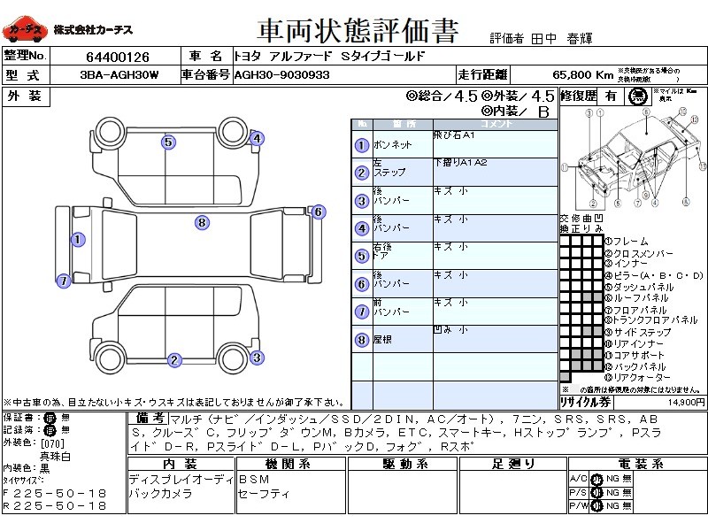| メーカー・車種 | トヨタ アルファード Sタイプゴールド (型式:3BA-AGH30W) | ||||||||||||||||||||||||||||||||||||||||