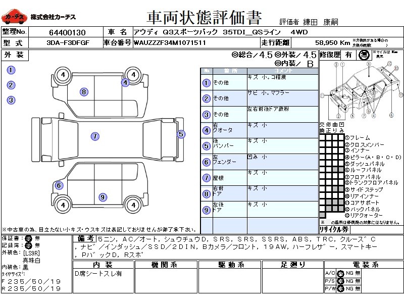 | メーカー・車種 | アウディ Q3スポーツバック 35TDI_QSライン (型式:3DA-F3DFGF) | ||||||||||||||||||||||||||||||||||||||||