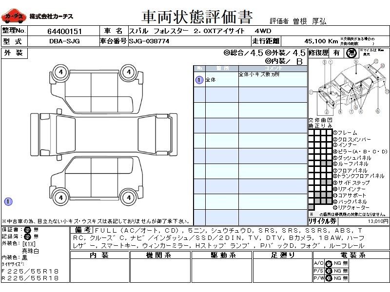 | メーカー・車種 | スバル フォレスター 2.0XTアイサイト (型式:DBA-SJG) | ||||||||||||||||||||||||||||||||||||||||