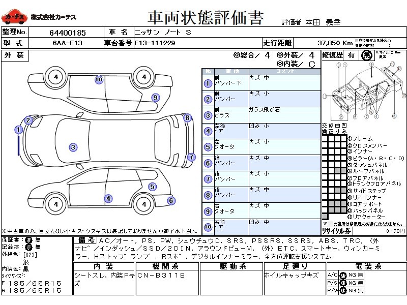| メーカー・車種 | 日産 ノート S (型式:6AA-E13) | ||||||||||||||||||||||||||||||||||||||||