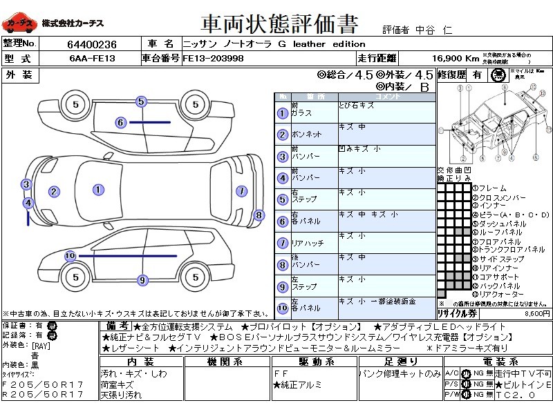 | メーカー・車種 | 日産 ノートオーラ GレザーEd (型式:6AA-FE13) | ||||||||||||||||||||||||||||||||||||||||