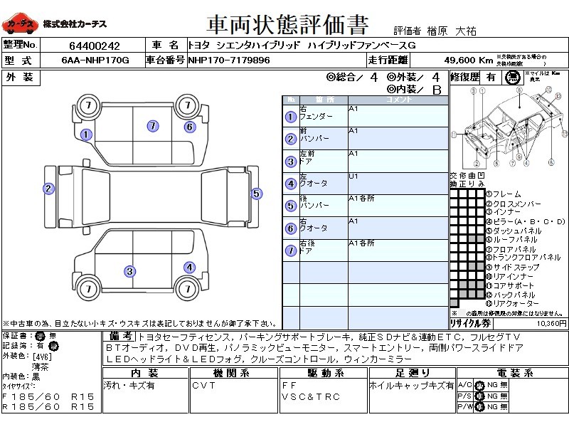 | メーカー・車種 | トヨタ シエンタハイブリッド ハイブリッドファンベースG (型式:6AA-NHP170G) | ||||||||||||||||||||||||||||||||||||||||