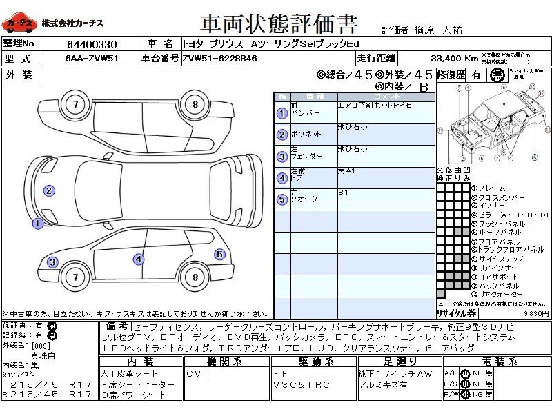 | メーカー・車種 | トヨタ プリウス AツーリングSelブラックEd (型式:6AA-ZVW51) | ||||||||||||||||||||||||||||||||||||||||