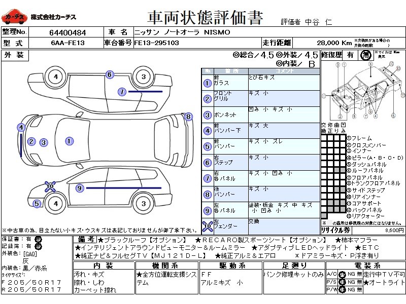 | メーカー・車種 | 日産 ノートオーラ ニスモ (型式:6AA-FE13) | ||||||||||||||||||||||||||||||||||||||||
