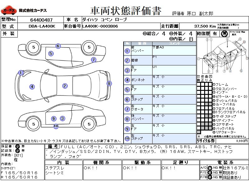 | メーカー・車種 | ダイハツ コペン ローブ (型式:DBA-LA400K) | ||||||||||||||||||||||||||||||||||||||||
