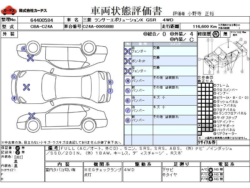 | メーカー・車種 | 三菱 ランサーエボリューションX GSR (型式:CBA-CZ4A) | ||||||||||||||||||||||||||||||||||||||||