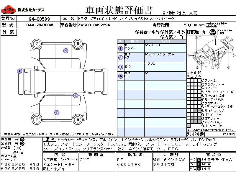 | メーカー・車種 | トヨタ ノアハイブリッド ハイブリッドSiダブルバイビー2 (型式:DAA-ZWR80W) | ||||||||||||||||||||||||||||||||||||||||
