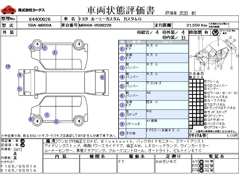 | メーカー・車種 | トヨタ ルーミーカスタム カスタムG (型式:5BA-M900A) | ||||||||||||||||||||||||||||||||||||||||