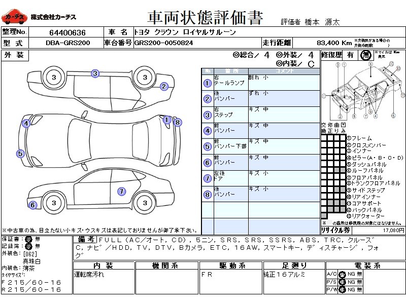 | メーカー・車種 | トヨタ クラウン ロイヤルサルーン (型式:DBA-GRS200) | ||||||||||||||||||||||||||||||||||||||||