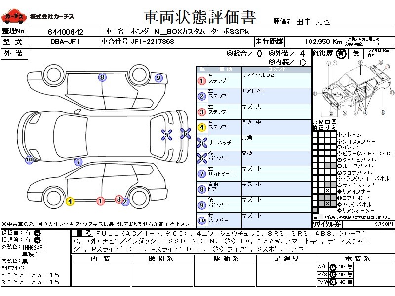| メーカー・車種 | ホンダ N BOXカスタム ターボSSPk (型式:DBA-JF1) | ||||||||||||||||||||||||||||||||||||||||