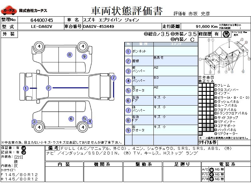 | メーカー・車種 | スズキ エブリイバン ジョイン (型式:LE-DA62V) | ||||||||||||||||||||||||||||||||||||||||