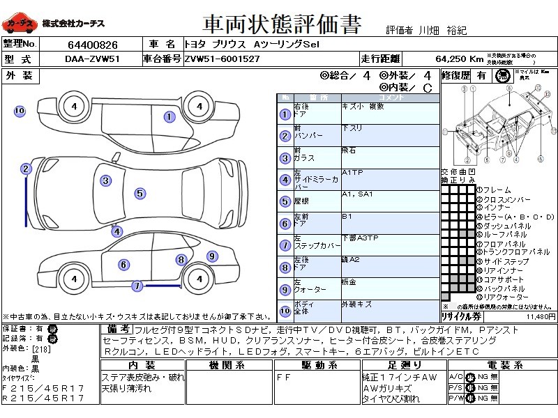 | メーカー・車種 | トヨタ プリウス AツーリングSel (型式:DAA-ZVW51) | ||||||||||||||||||||||||||||||||||||||||