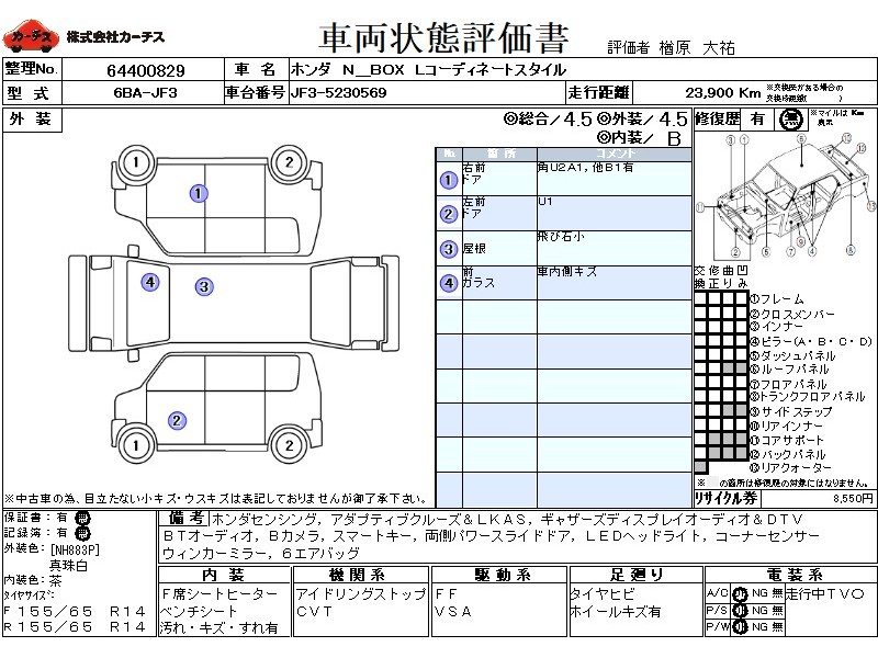 | メーカー・車種 | ホンダ N BOX Lコーディネートスタイル (型式:6BA-JF3) | ||||||||||||||||||||||||||||||||||||||||