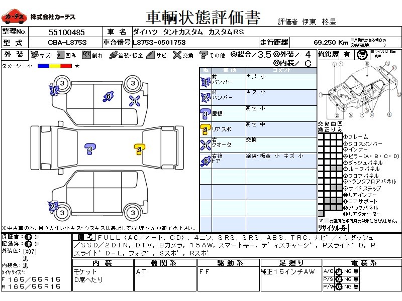 | メーカー・車種 | ダイハツ タントカスタム カスタムRS (型式:CBA-L375S) | ||||||||||||||||||||||||||||||||||||||||